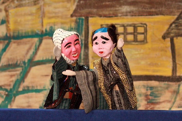 酒呑みで失敗ばかりする「金多」と、おっちょこちょいだが情にもろい「豆蔵」。全編津軽弁で繰り広げるこの劇は、伝統を守りながらも世相と風刺を取り入れる、懐の深い劇です。いつも笑いに満ちた2人の姿を、劇場という非日常空間でお楽しみください。
