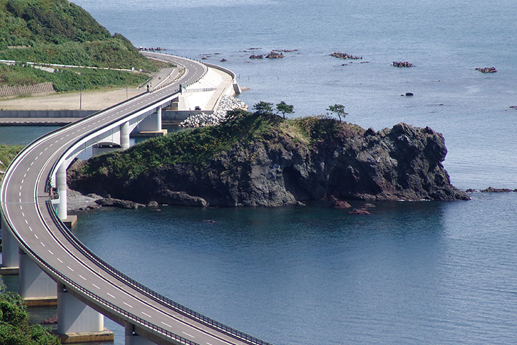 ライオン海道の橋げたには、訪れる皆さんを出迎えてくれるライオン像があります。橋からは、権現崎に沈む夕陽や四季によって色が微妙に変化する様々な夕陽も見られます。国道339号線、小泊にあるおさかな海岸を直進するとライオン街道を通行いたします。