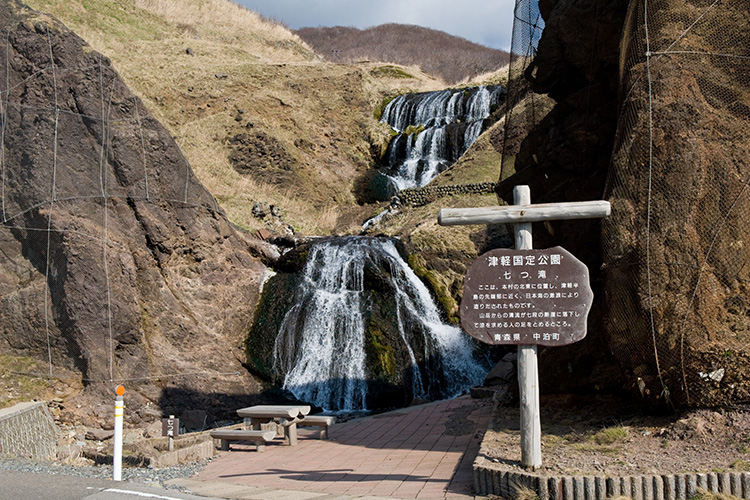 小泊~竜飛岬をつなぐ国道339号、通称「竜泊ライン」にある、高さ21mの滝七段の岩肌を伝い流れることから“七ツ滝”という名がつけられたされています。季節によって、海からの強風により滝の一部が飛沫となって舞い上がるという神秘的な情景が楽しめます。また、道路沿いにあるので、車の窓からも眺めることができます。