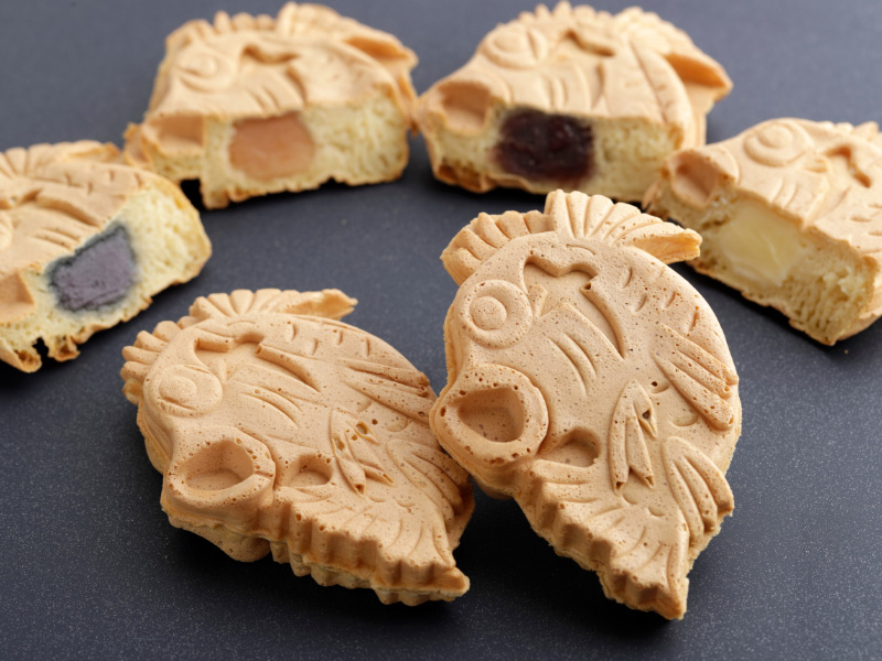 中里高校生によるソーシャル・ビジネス・プロジェクト同好会が考案、愛知県の鬼瓦職人とトヨタの高級車部品を作る企業の協力で型を切り出したオリジナルお焼き。粒あん・ブルーベリー・トマト・カスタードの4種。